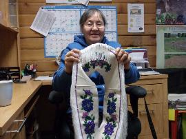 Sarah Rosemary Lennie was born in Fort Resolution, NT, and now lives in Tulita, NT. She is an established crafts and fashion artist who has been producing her art for the last 40 years. She has other artists in her family that do relatively the same sort of artwork that she does. Her art comes naturally to her and she enjoys it immensely. Sarah's artwork can be viewed and purchased anywhere in or around the Tulita area.