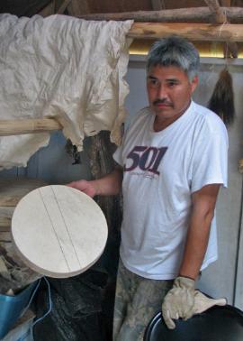 Richard David Andrew is an artist and craftsman specializing in woodwork, carving, drum making, snowshoe making and traditional fine crafts. Living in Tulita, NT, Richard has engaged in the arts for over twenty-five years and today he continues to be inspired by the people around him. "I was born in 1968, to William and Marguerite Andrew. Both of my parents passed away while I was a young child. Throughout the years, I have kept my traditional life and language very much alive. I continue to tan moose hides, drive a dog team, and hunt and trap. I am very much involved with the youth of Tulita. I have been teaching the youth in Tulita about the Dene culture, I have taken the youth out on the land, and also go into the classrooms and talk about the values and life of the Dene in the past. For the past two years, myself, along with my brother, Chief Frank Andrew, and brother in-law Roy MacCauley have been teaching the youth the songs, signs, and drumming involved in hand-games. I have travelled with the youth on numerous occasions, promoting the Dene culture and language. On Thursday, October 16th, 2008, I was received an award from the Aboriginal Sports (ASCWA) for all my work with the youth, over the years.