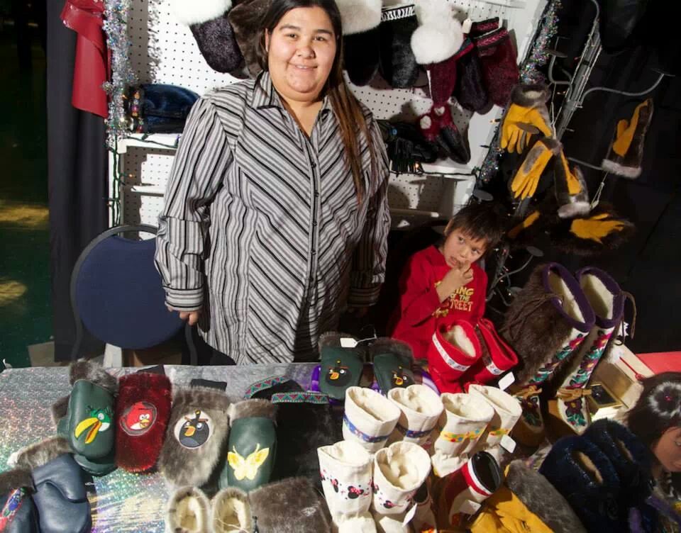 Today art is my passion I don’t think I could go without it. I spend a lot of time on the land with my family where we work a lot with traditional food – but I need to sew! I just want to make so many different things to see how they will turn out. I like sewing for kids because they look so cute when they are dressed up. I like making canvass mukluks because kids always think they can run faster when they put them on. I put elastics in them to make them unique and to help them stay on.