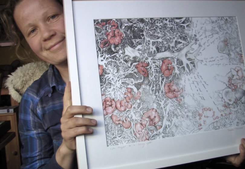 In my current artwork I weave all of these realities into the tapestry of northern landscape. I take time to explore graphic qualities of lichen, rock and landscape with the subtle impact of colour pencil and graphite, creating depth within the layers of applying single colours. It's a very meticulous process, which has lead me to the even more intricate and quiet process of beading. That pace and the connection and implication of drawing and beading in an artist's everyday life, specifically in this environment, entertain and interest me very much.