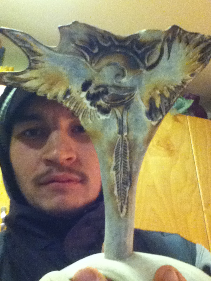 I would sit by may dad and learn how to carve and see how he would would pull the sculpture from within the horn, bone, ivory of wood. through the years I would also watch my great uncle Sonny Macdonald make small ivory jewelry  I would try to make an eagle head all the time over and over and he would tell me how to's about the eyes and so on.... Now so many years later i have been practicing beside my Father for the last few years trying to find a style of my own. I have come to enjoy carving in caribou horn although at first proved to be very hard to sculpt but over time I became stronger and in many sittings I became more devoted to trying to finish a full sculpture....the felling felt after finishing ones art is very motivating.... There is a great pride in some minds eye to be able to take a piece of bone or horn from the wilderness and forge within that hard material a work of art for all to see, Is rewarding to me very much as an ARTIST, for if I had not found that horn it would have surly rotted and disappeared in the vegetation....Now preserved for life....
