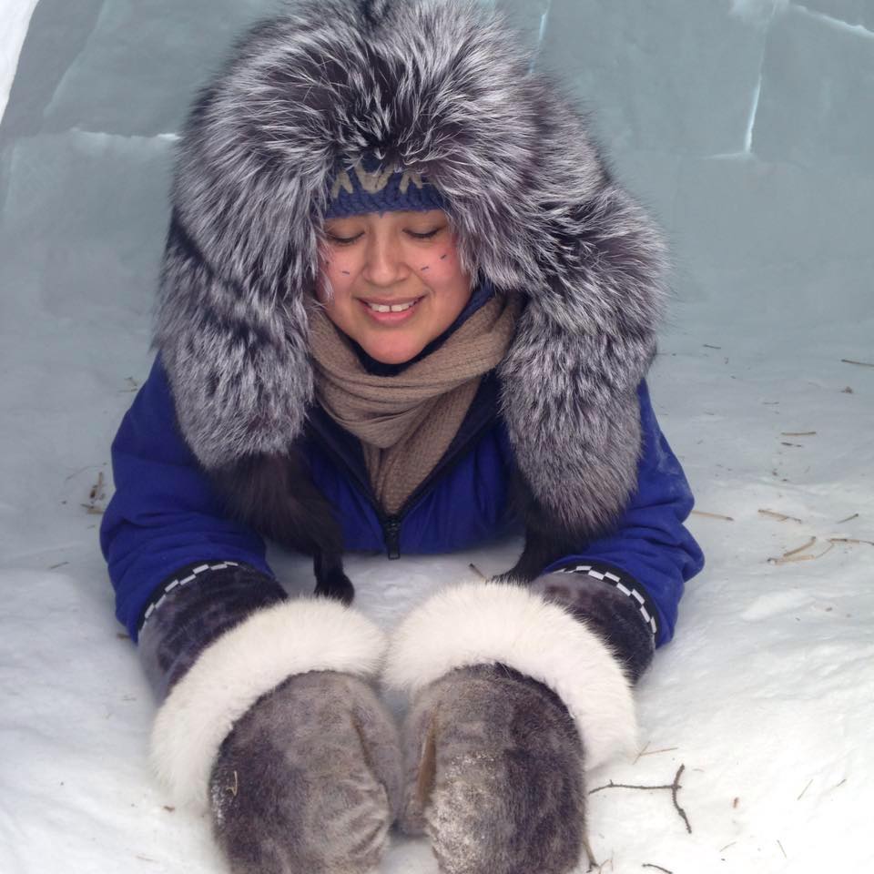 Hovak Johnston is an Inuk woman raised on the land in the Kitikmeot Region in Nunavut until she was sent away to school.  She uses her Inuinnaqtun name Hovak given to her at birth as a way to carry her traditions and honor her past relatives to whom she was named after.
