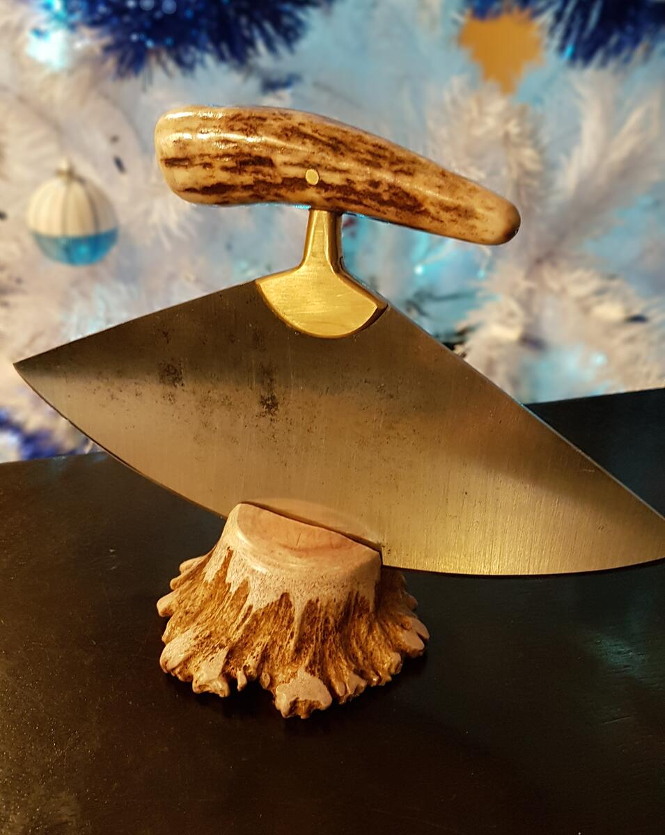 I source my materials from wherever I can find them. I’ll get old steel blades locally if I can, but most of the time I will buy them from somewhere down south, where they’re easier to find. Old blades are often hard enough to maintain an edge, while being soft enough to make it as dull or as sharp as the person using it needs it to be. I use moose antler and hard wood for the handles.